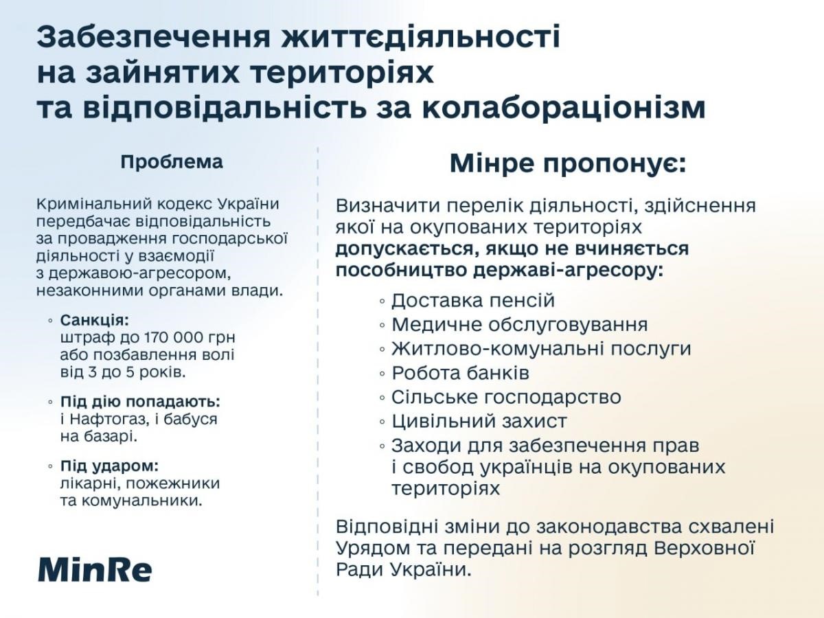У відповідь на це міністерство утворило робочу групу з понад 160 представників органів влади, бізнесу, фахівців права, громадських організацій, яка й напрацювала два законопроєкти, що чітко дають зрозуміти, яка діяльність не є колабораціонізмом.