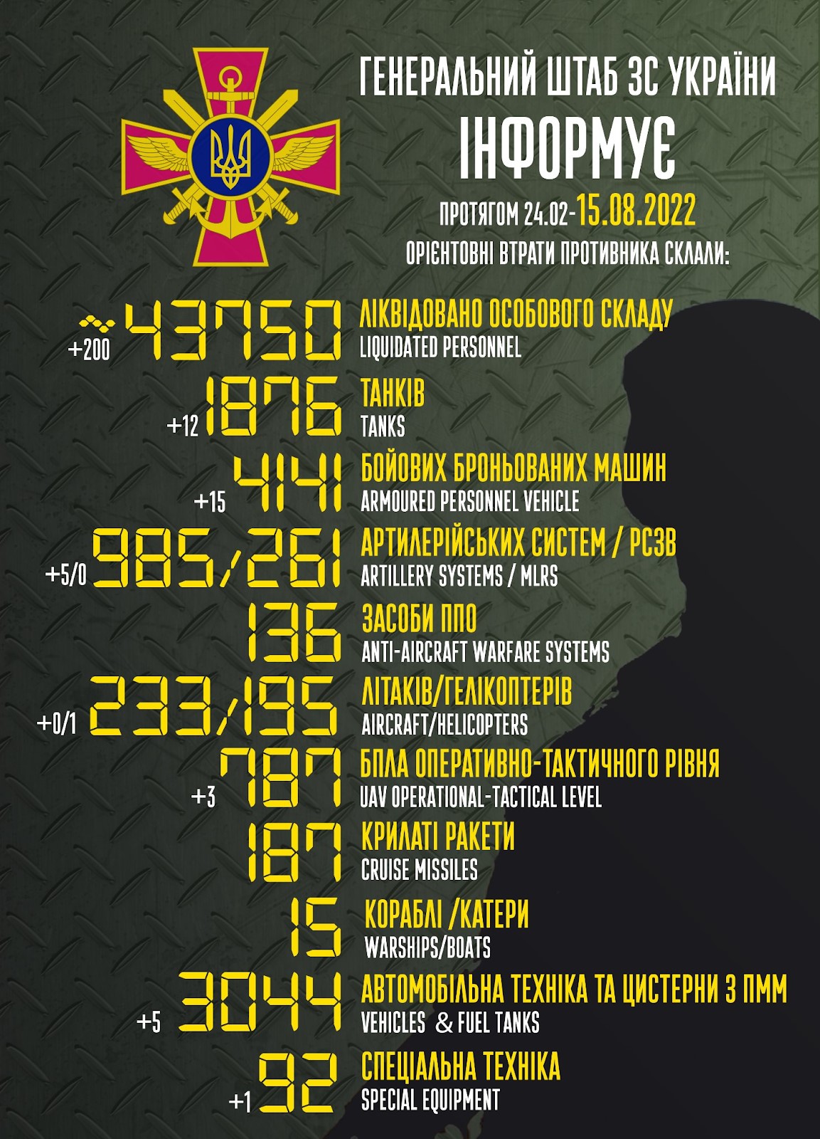 Загалом з початку повномасштабної агресії рф проти України загальні втрати живої сили ворога орієнтовно складають 43750 осіб. Про це повідомляє РеІнформ із посиланням на Генеральний штаб ЗС України.