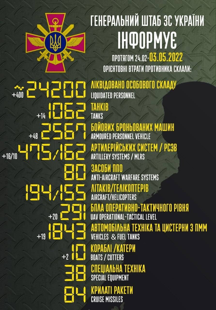 3 Травня 2022, 12:38За період війни росії в Україні з 24 лютого по 3 травня особисті втрати ворога орієнтовно склали 24 200 осіб.