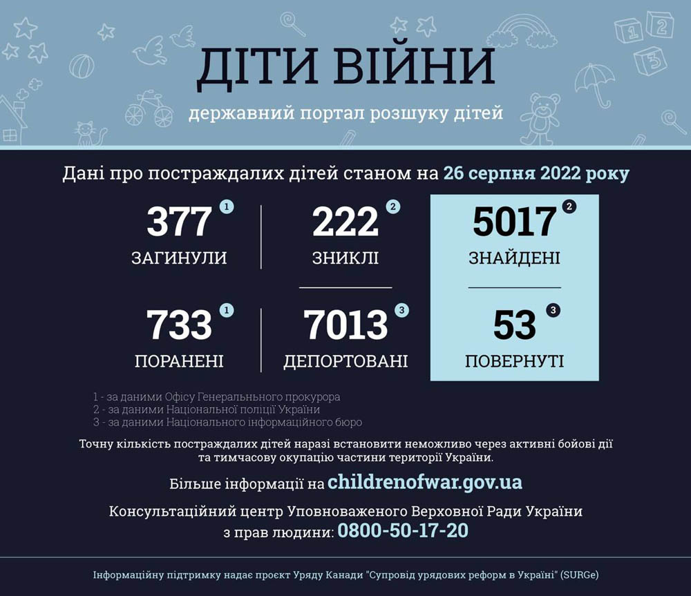 26 Серпня 2022, 10:51Понад 1110 дітей постраждали в Україні з початку повномасштабної збройної агресії російської федерації. За офіційною інформацією ювенальних прокурорів, станом на ранок 26 серпня 2022 року 377 дітей загинули та понад 733 отримали поранення різного ступеня тяжкості.