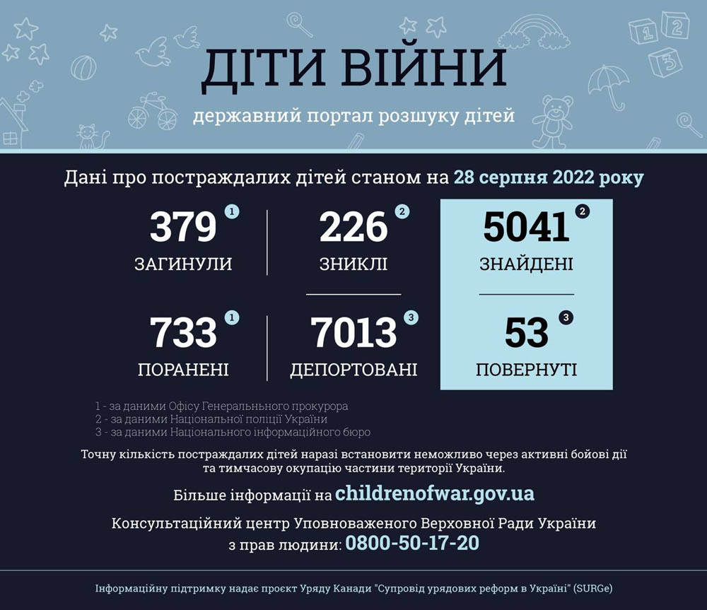 За офіційною інформацією ювенальних прокурорів, 379 дітей загинули та понад 733 отримали поранення різного ступеню тяжкості.