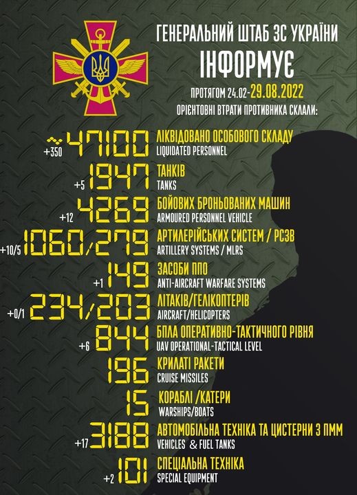 Загальні втрати особового складу ворога з 24 лютого по 29 серпня орієнтовно склали 47100 осіб, повідомляє РеІнформ з посиланням на Генеральний штаб ЗС України.