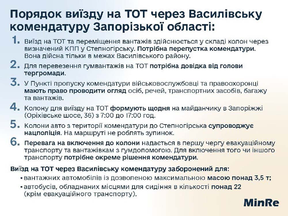 - Виїзд на ТОТ і переміщення вантажів здійснюється у складі колон через визначений КПП у Степногірську. Потрібна перепустка комендатури. Вона дійсна тільки в межах Василівського району.