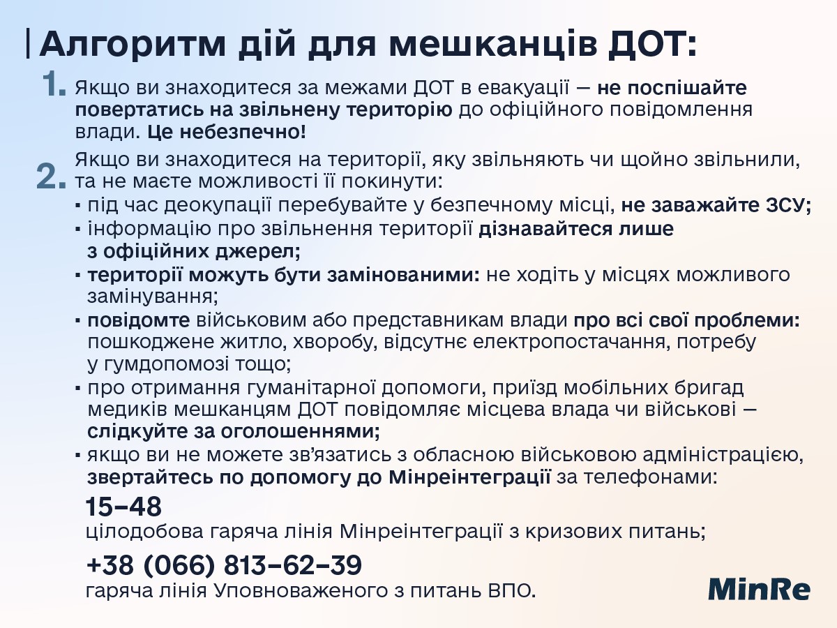 Мешканці звільнених територій можуть звернутися за допомогою на гарячу лінію Мінреінтеграції за телефоном: 1548 чи на гарячу лінію Уповноваженого з питань ВПО: +38 (066) 813-62-39. Ми постійно на зв’язку!