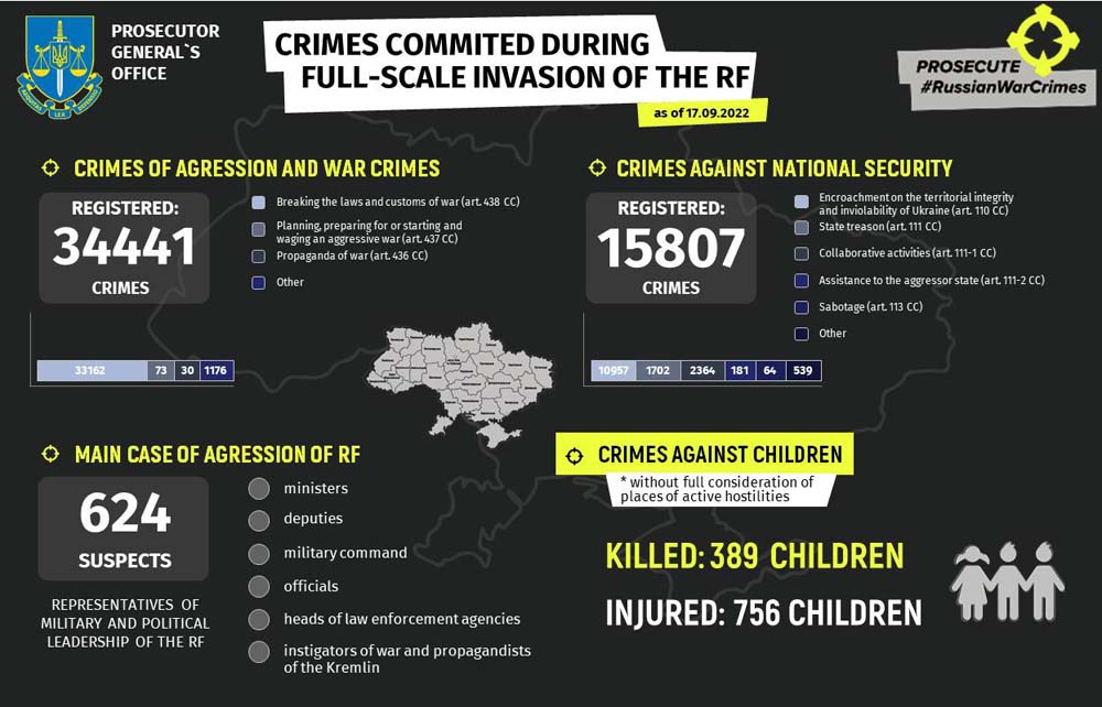 17 Вересня 2022, 10:21На ранок 17 вересня в Офісі Генерального прокурора задокументовано 34441 злочин агресії рф, воєнний злочин, а також 15807 злочинів проти національної безпеки України. Про це повідомляє РеІнформ з посиланням на фейсбук Офісу Генерального прокурора.
