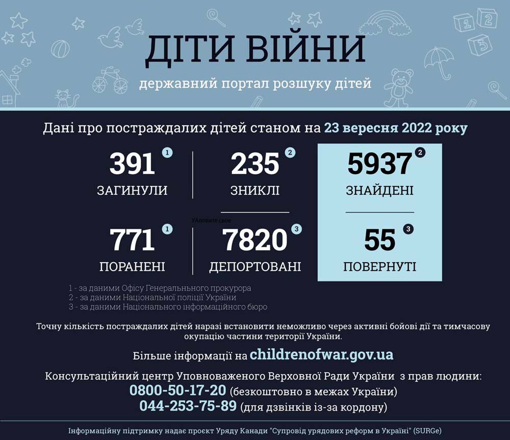 За даними державного порталу розшуку дітей «Діти війни», станом на 23 вересня 235 дітей зникли, 7820 є депортованими росією, 5937 вдалося знайти, а 55 – повернути до України.