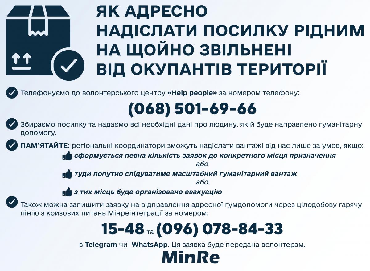 Детальніше про те, як передати адресну гуманітарну допомогу рідним на звільнені території,- в інфографіці.