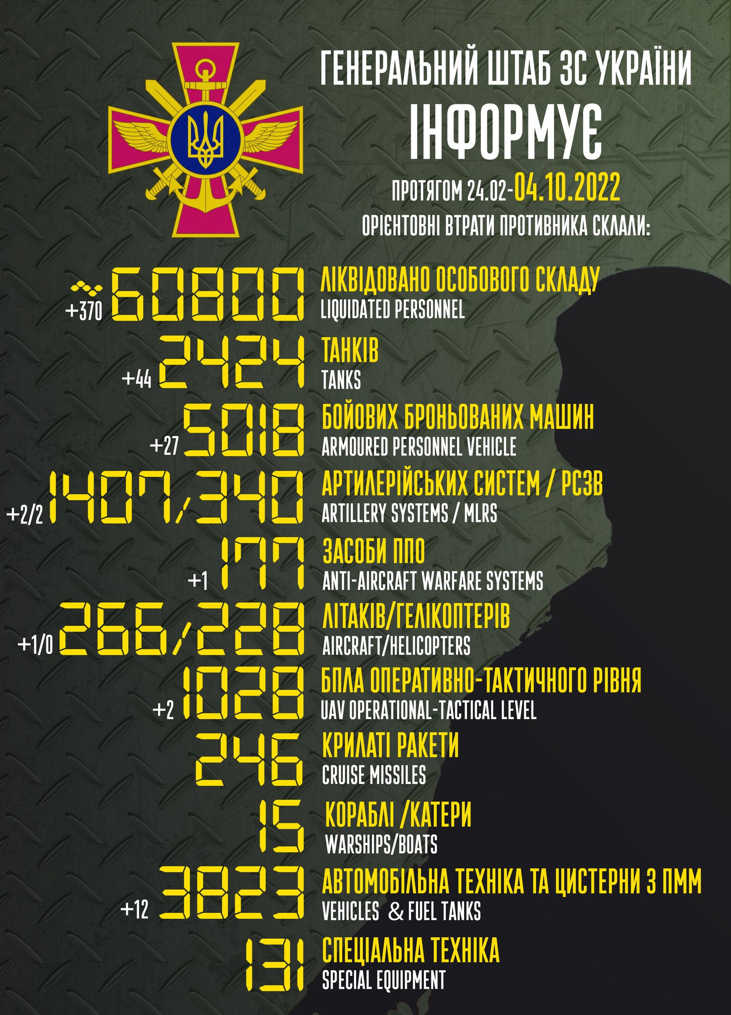 4 Жовтня 2022, 11:08Протягом повномасштабної агресії рф проти України, з 24 лютого по 4 жовтня, загальні втрати живої сили ворога орієнтовно становлять 60 800 осіб.