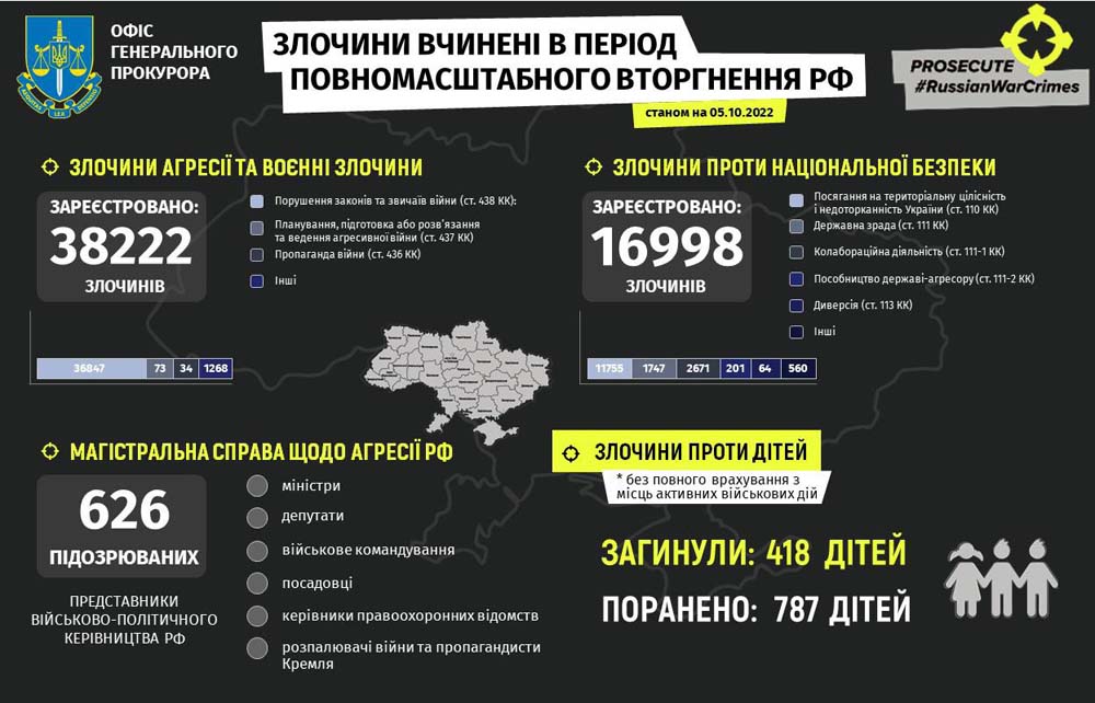 Загалом зареєстровано 38 222 злочини агресії та воєнних злочини росії (порушення законів і звичаїв війни; планування, підготовка, розв’язання та ведення агресивної війни; пропаганда війни).