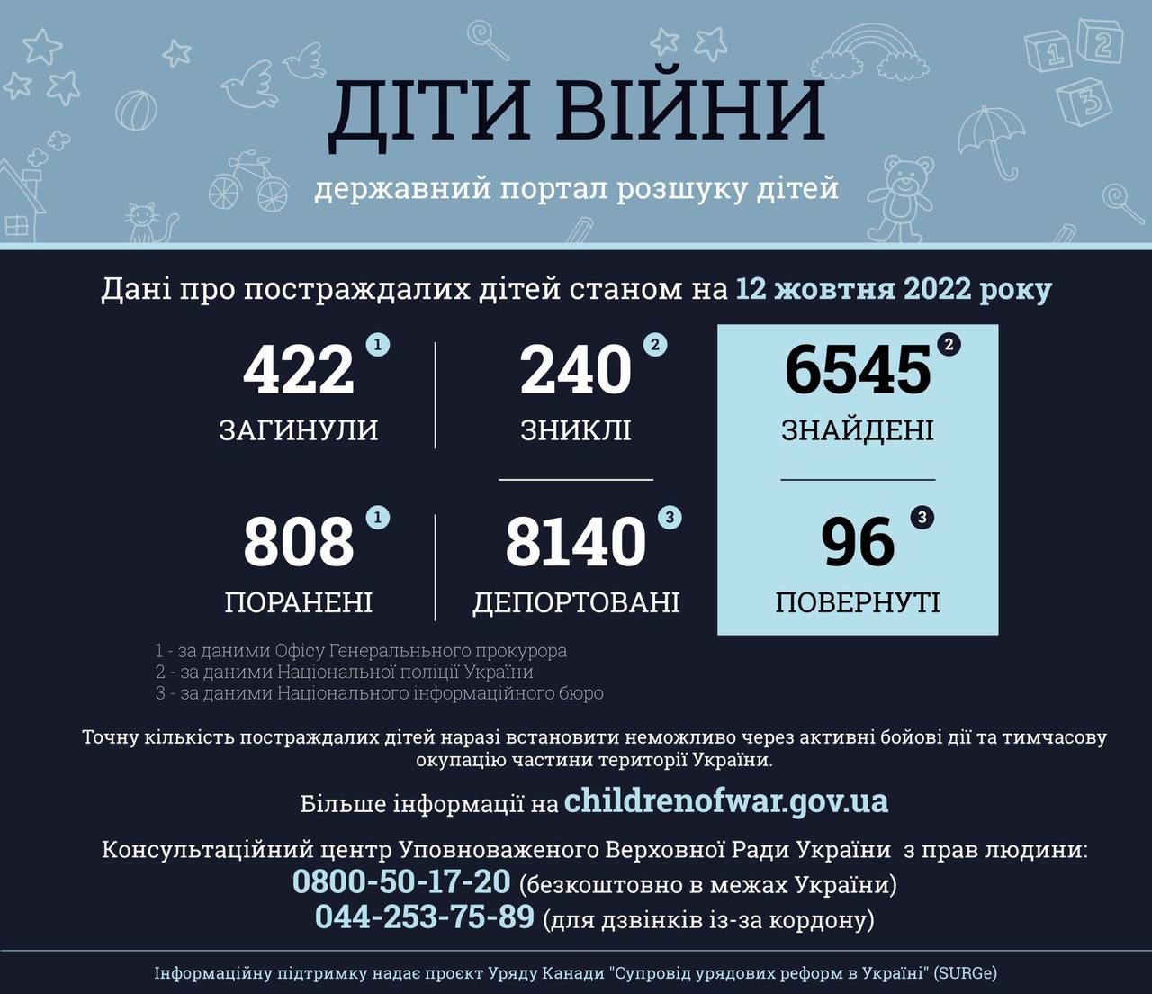 За даними державного порталу розшуку дітей «Діти війни», станом на 12 жовтня, 240 дітей зникли, 8140 – депортовані рф, 6545 – знайдені, 96 – повернуті до України.