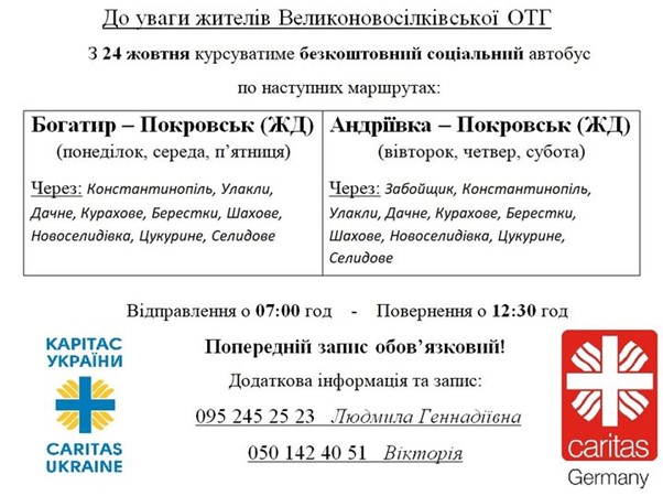 Автобус за маршрутом Богатир – Покровськ (залізничний вокзал) відправляється у понеділок, середу та п’ятницю й прямує через Константинопіль, Улакли, Дачне, Курахове, Берестки, Шахове, Новоселидівку, Цукури, Селидове.