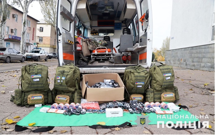 Світовий конґрес українців передав поліцейським 5 тактичних рюкзаків з усім необхідним для порятунку життя. Медичні набори використовуватимуть парамедики, які несуть службу біля лінії фронту та в деокупованих містах.