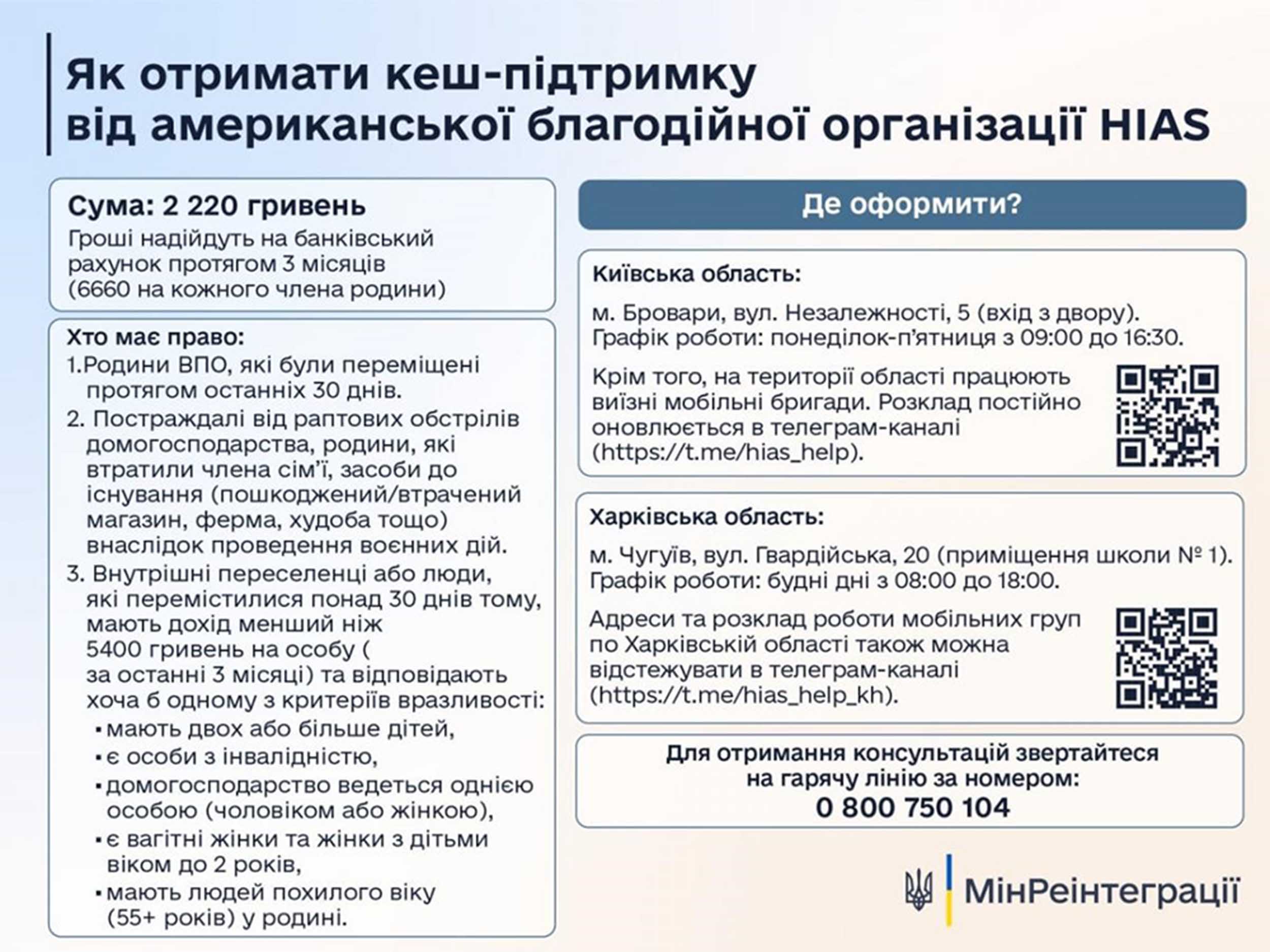 Грошова допомога надається у розмірі 2200 гривень на кожного члена родини впродовж 3 місяців. Звернутися по фінансову допомогу можуть не тільки люди, які втратили житло та засоби до існування внаслідок воєнних дій на зазначених територіях, але й вразливі родини ВПО із цих областей. Також допомогу можуть отримати особи з інвалідністю, члени неповних сімей тощо.