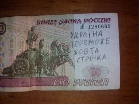 ЦНС розмістив фотографії банкнот номіналом 100 і 1000 рублів з написами від руки російською й українською мовами: «Росія програє, Путін – вбивця» та «Україна переможе. Жовта стрічка».