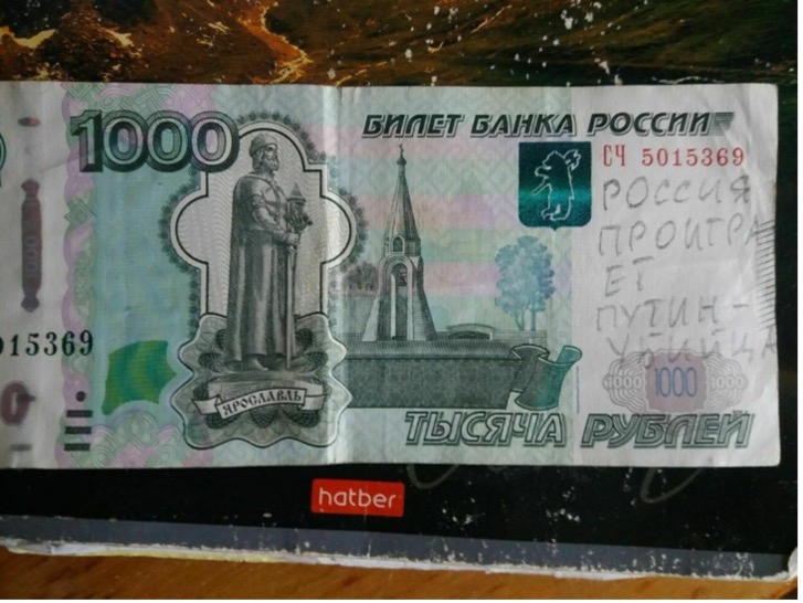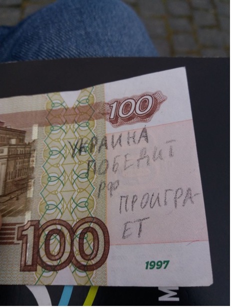 ЦНС розмістив фотографії банкнот номіналом 100 і 1000 рублів з написами від руки російською й українською мовами: «Росія програє, Путін – вбивця» та «Україна переможе. Жовта стрічка».
