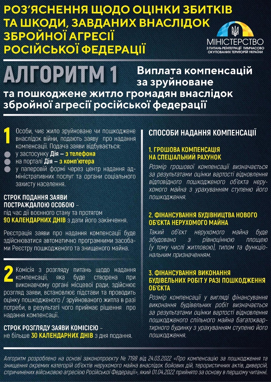 27 Квітня 2022, 20:47З початку вторгення рф в Україну внаслідок обстрілів міст і сіл у різних областях ракетами та авіацією ворога щоденно піддаються руйнуванню житлові будинки та інфраструктура. Міністерство з питань реінтеграції тимчасово окупованих територій України інформує про порядок визначення шкоди та збитків, завданих внаслідок збройної агресії росії.