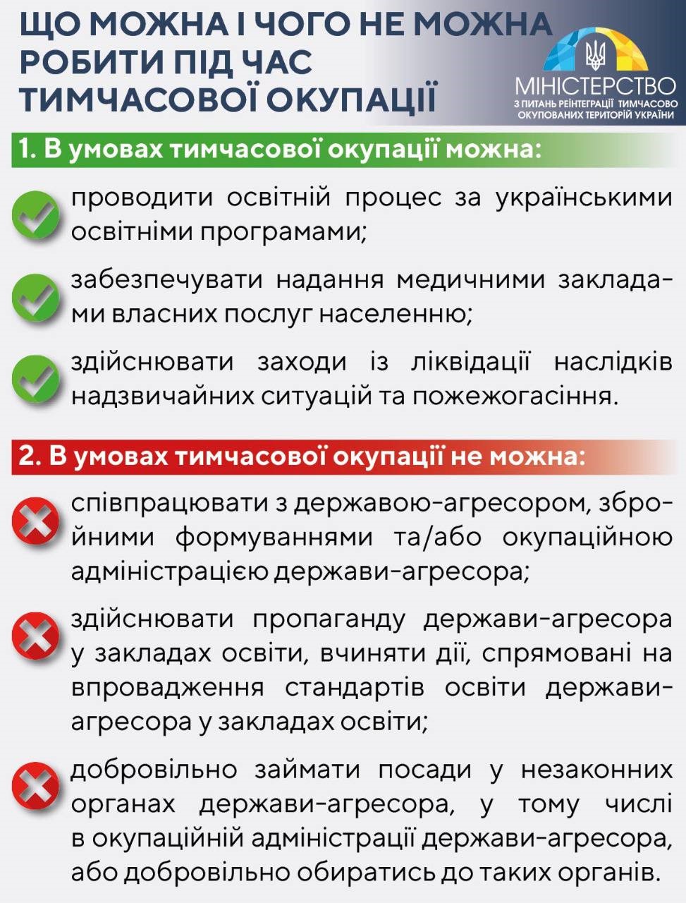 18 Квітня 2022, 21:03Наші захисники героїчно захищають кожен клаптик української землі. Однак, в умовах воєнного стану потрібно бути готовими до різних сценаріїв розгортання подій. Міністерство з питань реінтеграції тимчасово окупованих територій України підготувало загальну інструкцію: що можна і чого не можна робити під час тимчасової окупації території, на якій ви знаходитесь.