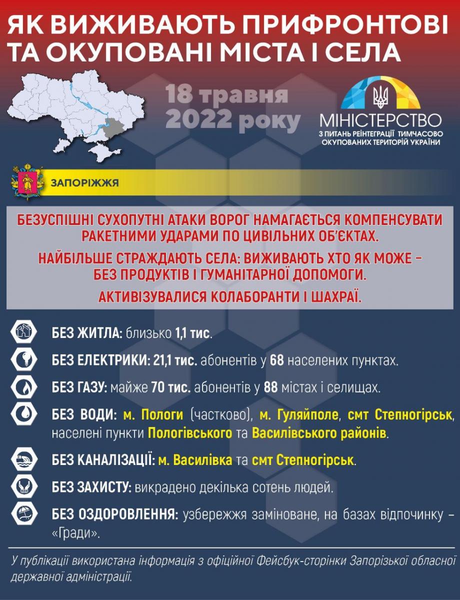 У публікації використана інформація з офіційної Фейсбук-сторінки Запорізької обласної державної адміністрації та офіційного Телеграм-каналу керівника військової адміністрації. Оскільки бойові дії на території області тривають, навести повну і точну статистику щодо ситуації на непідконтрольних територіях наразі неможливо.