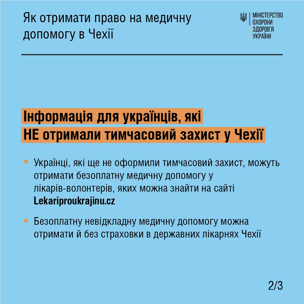 Українці, які ще не оформили статус тимчасового захисту, можуть отримати безоплатну медичну допомогу в лікарів-волонтерів. Знайти їх можна на сайті https://lekariproukrajinu.cz.