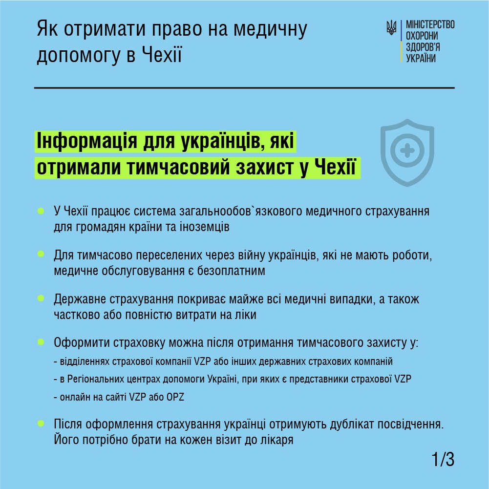 Нині у Чехії працює система загальнообовʼязкового медичного страхування для всіх громадян держави та іноземців. Оформити страховку варто лише після отримання тимчасового захисту. Про це повідомляє РеІнформ з посиланням на Facebook-сторінку Міністерства охорони здоров‘я.