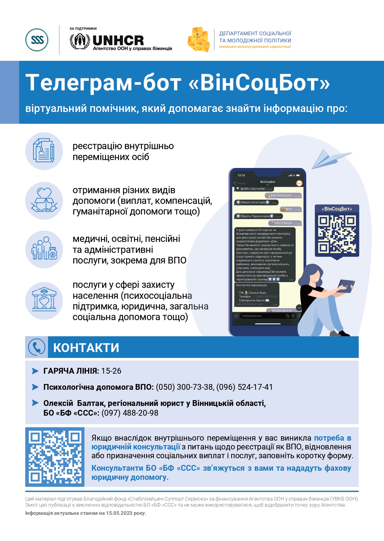 Крім того, за підтримки гуманітарної організації «Інтерсос» розроблено Telegram бот — «Вінсоцбот». Він містить актуальну інформацію про доступні послуги та допомогу для місцевих та переселенців.