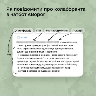 - детальний опис та фото, які підтверджують факт співпраці з окупантами.