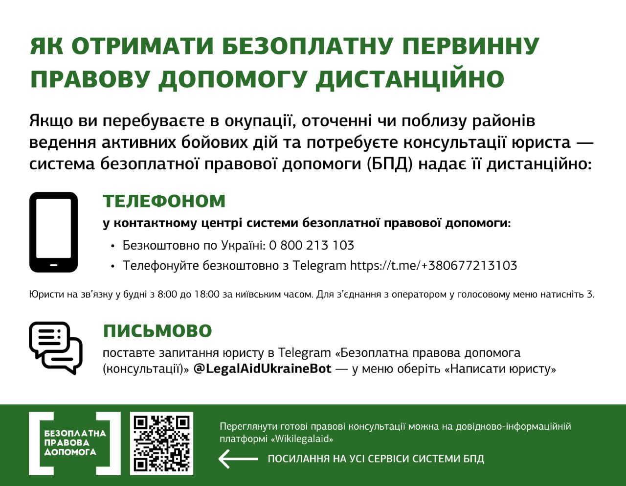 При цьому громадяни України, які перебувають на тимчасово окупованих територіях або за межами країни, можуть отримати безоплатну первинну або вторинну правничу допомогу дистанційно.