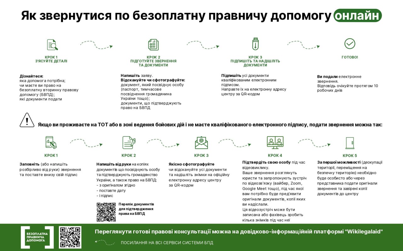 Як дистанційно отримати правничу допомогу, можна ознайомитись у наведених інфографіках.