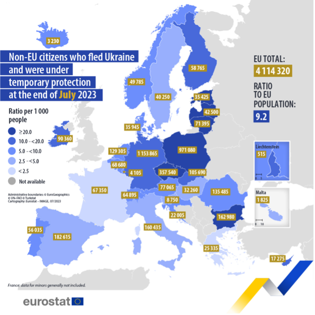 Станом на 31 липня понад 4,1 млн людей, які втекли від війни в Україні, отримали тимчасовий захист у країнах ЄС. Про це РеІнформ повідомляє з посиланням на дані Євростату.