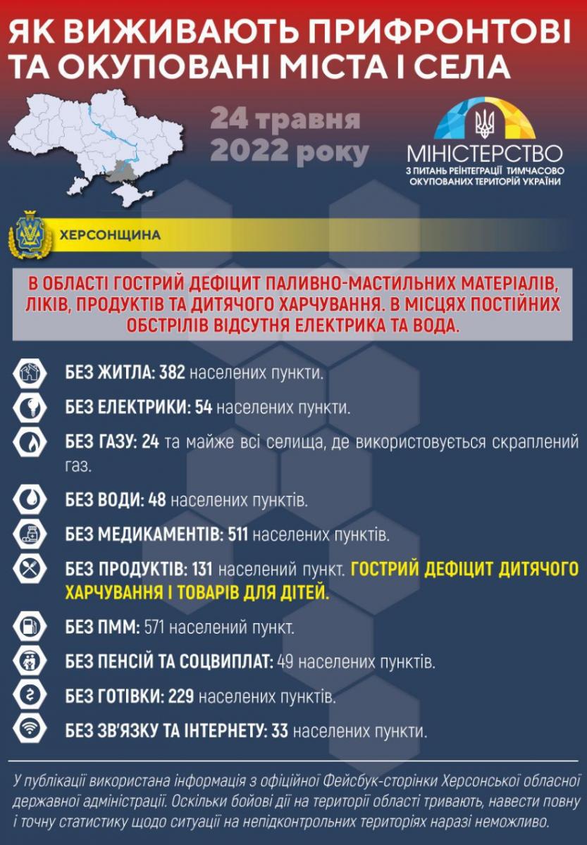 У матеріалі використана інформація з офіційної Фейсбук-сторінки Херсонської обласної державної адміністрації. Оскільки бойові дії на території області тривають, навести повну і точну статистику щодо ситуації на непідконтрольних територіях наразі неможливо.