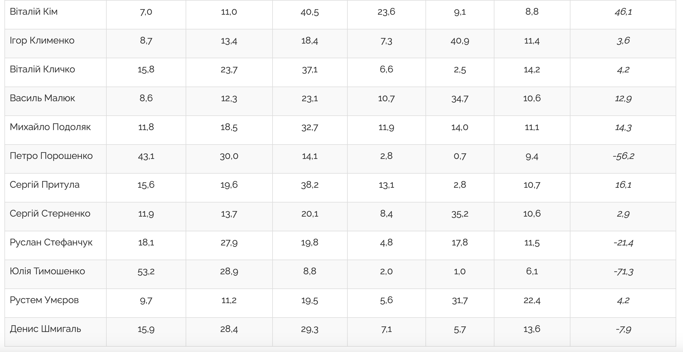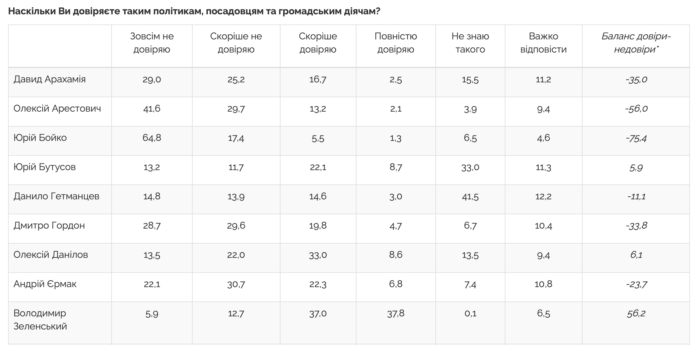 Також серед лідерів довіри до конкретних осіб є очільник Миколаївської ОВА Віталій Кім (64%), волонтер Сергій Притула (51%), голова СБУ Василь Малюк (34%) та інші.