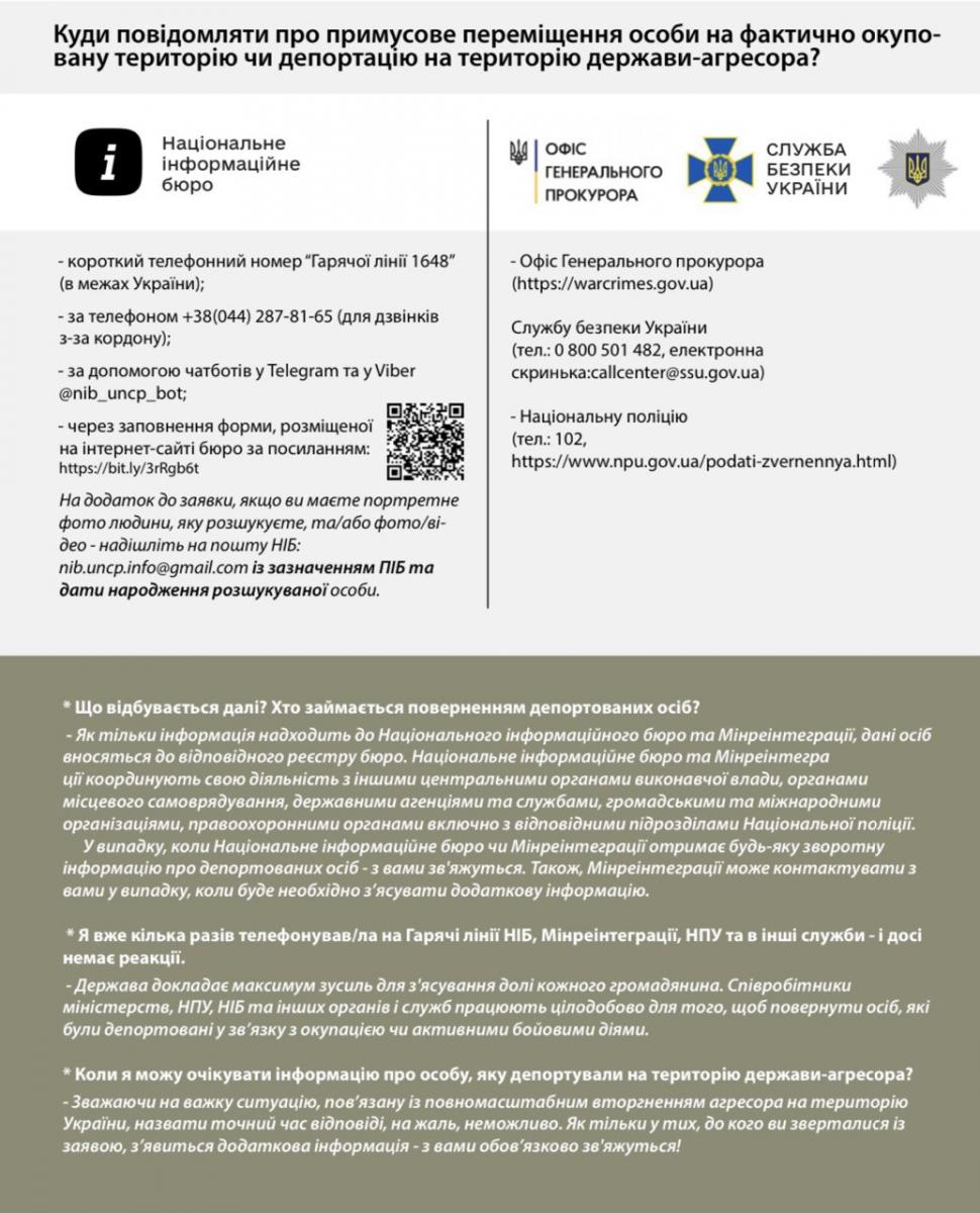 Національне інформаційне бюро повідомило алгоритм дій у разі, якщо дитину примусово перемістили на тимчасово окуповану територію України або примусово депортували у державу-агресора чи в іншу країну.