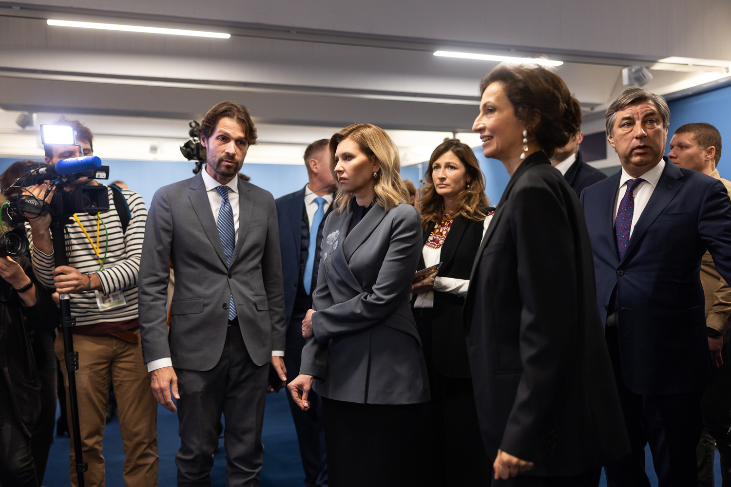 «Вдячна пані Одрі за зусилля, яких вона та її організація докладають, щоб уберегти від російського варварства українську спадщину. За внесення об’єктів всесвітньої спадщини в Одесі, Києві та Львові до Списку ЮНЕСКО під загрозою та надання посиленого захисту ще 20 об’єктам. За допомогу у сфері освіти: тут ЮНЕСКО опікується впровадженням психологічної підтримки, і це важливий внесок у нашу Національну програму ментального здоров’я, саму українську стійкість, що вже стала легендою», – наголосила дружина президента.