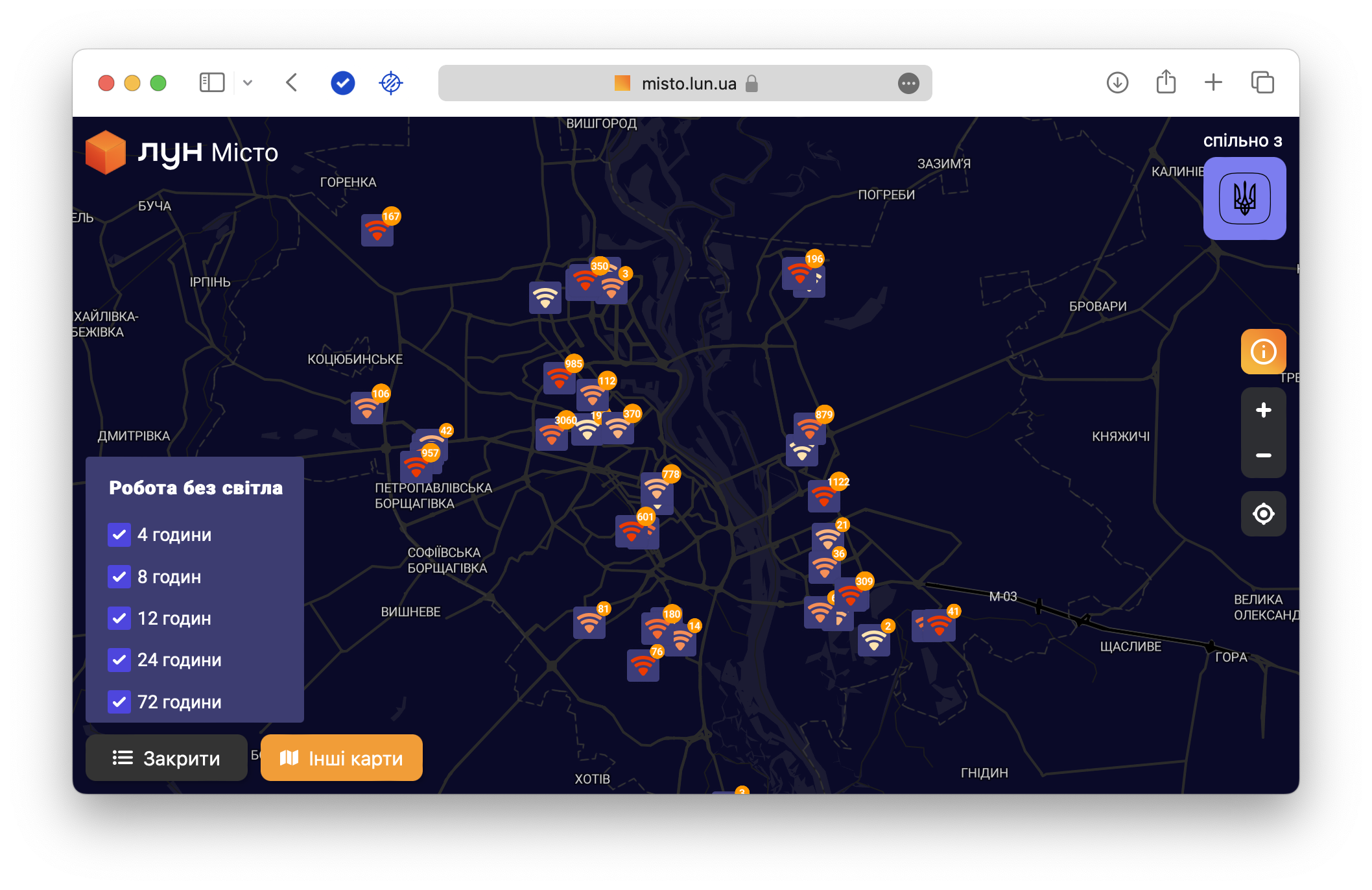 Якщо годин роботи інтернету недостатньо, одразу на мапі знаходьте найближчого провайдера, який серйозніше підготувався до блекаутів.