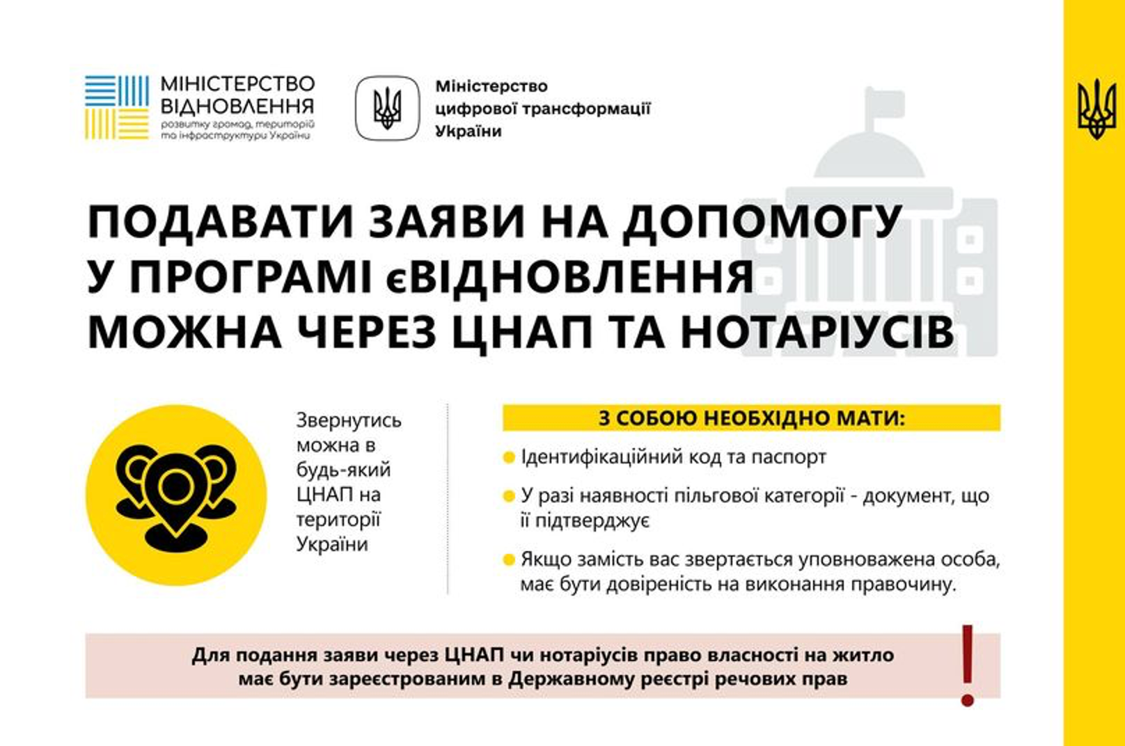 єВідновлення: заяву на отримання допомоги тепер можна подати через ЦНАПи або нотаріусів
