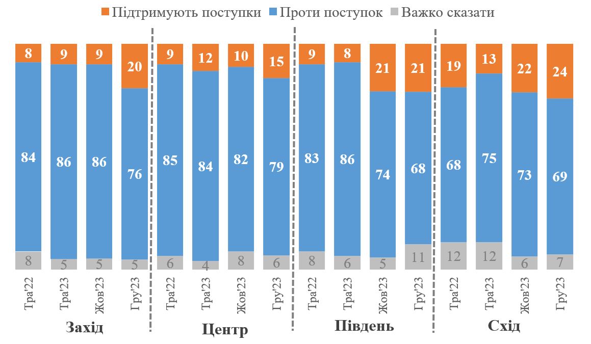 Як зауважують соціологи, якщо між травнем і жовтнем 2023 року приріст частки тих, хто готовий до поступок, був переважно за рахунок півдня і сходу, то приріст між жовтнем і груднем –– за рахунок заходу і центру. Так, на заході зростання частки таких респондентів становить з 9% у жовтні до 20%, у центрі – з 10% до 15%. На півдні та сході зміни в частці тих, хто готовий до поступок, значно менш помітні, хоча також спостерігаються негативні тенденції.