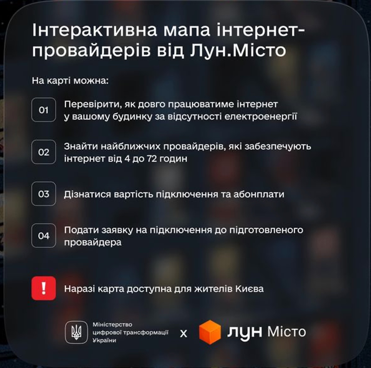 Також можна скористатися інтерактивною мапою інтернет-провайдерів від Лун. Місто. Наразі на ній можна: