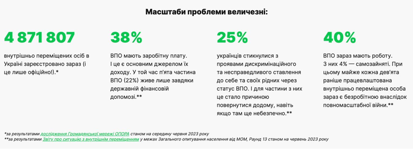 «Наявність доходу і роботи є одним з надважливих факторів для успішної інтеграції ВПО на новому місці проживання. Адже це те, що дозволяє вимушено переміщеним українцям забезпечувати базові потреби, як-от хороше житло, харчування, що надалі впливає на якість соціальної інтеграції. При цьому, за оцінками МОМ, кожна п’ята внутрішньо переміщена особа (загалом це близько 900 тисяч українців) хотіла б залишитись у новій громаді, якісно в ній інтегруватись і зробити її своїм новим домом. І ми можемо з цим допомогти», – наголосили в Happy Monday.