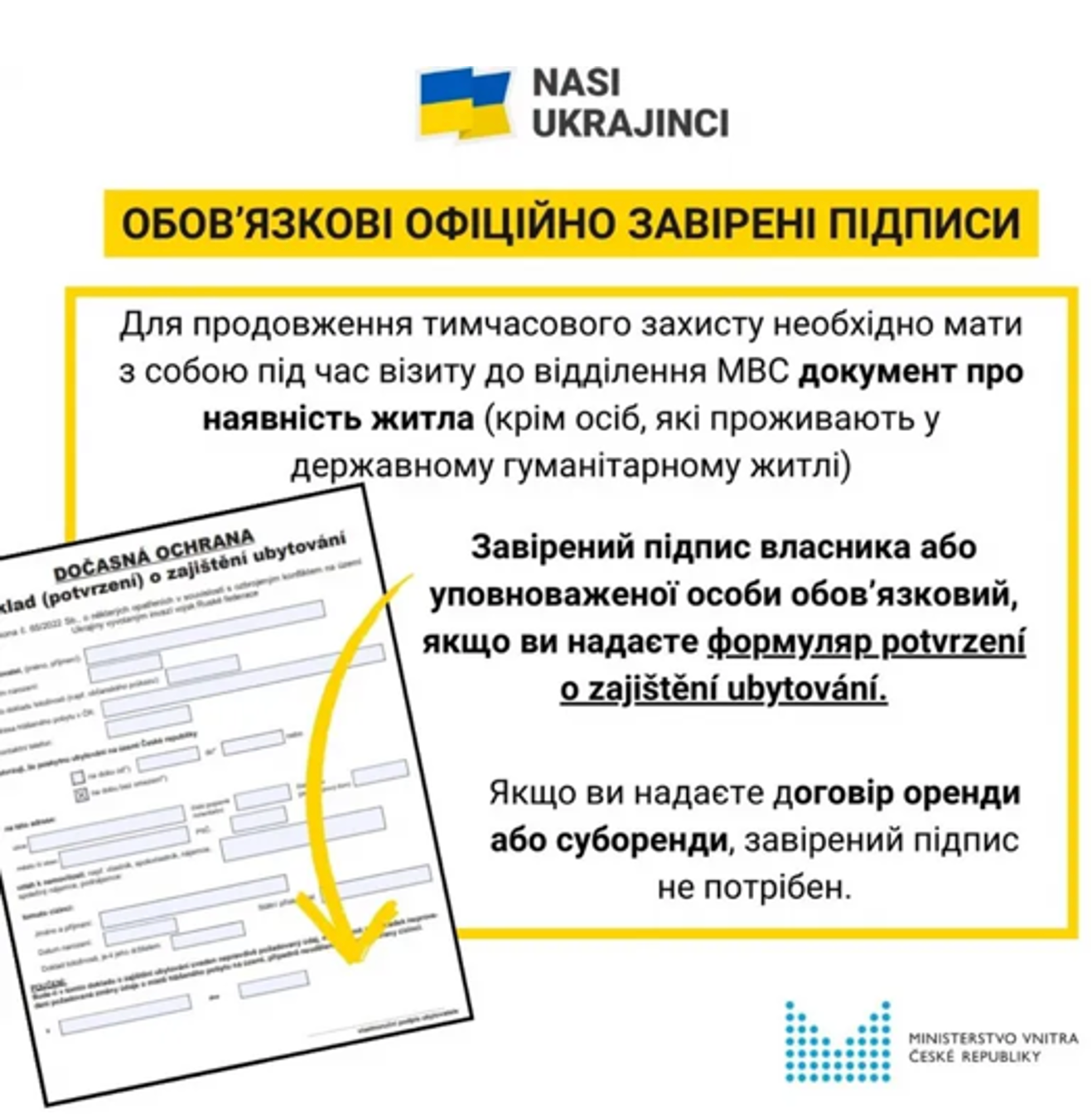 Відтепер після онлайн-реєстрації на продовження тимчасового захисту біженцям треба буде відвідати відділення Міністерства внутрішніх справ, щоб отримати нову візову наклейку. Під час візиту необхідно надати документ про наявність житла на бланку із засвідченим підписом власника (у нотаріуса або в будь-якому відділенні CzechPoint, наприклад, на пошті).