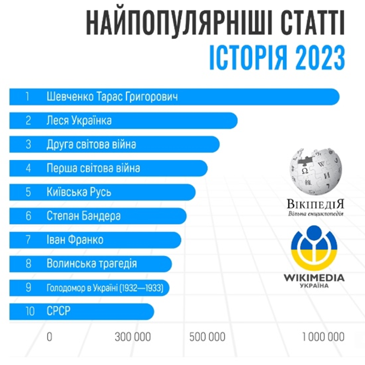 На другому місці — стаття «Російське вторгнення в Україну (з 2022)», яка отримала понад 1,3 млн переглядів. Третю сходинку посіла стаття про українського поета Тараса Шевченка (майже 1 млн). На четвертому місці — стаття про місто Київ, на п’ятому —про президента рф володимира путіна.