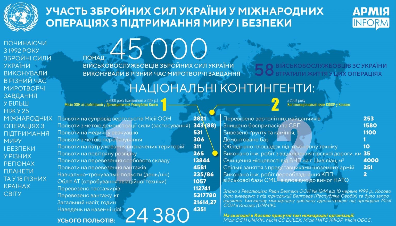 У міжнародних операціях з підтримання миру і безпеки взяло участь понад 45 тисяч українських військовослужбовців у більш ніж 25 міжнародних операціях у різних регіонах планети та у 18 державах. 58 військовослужбовців ЗС України у цих операціях загинули.