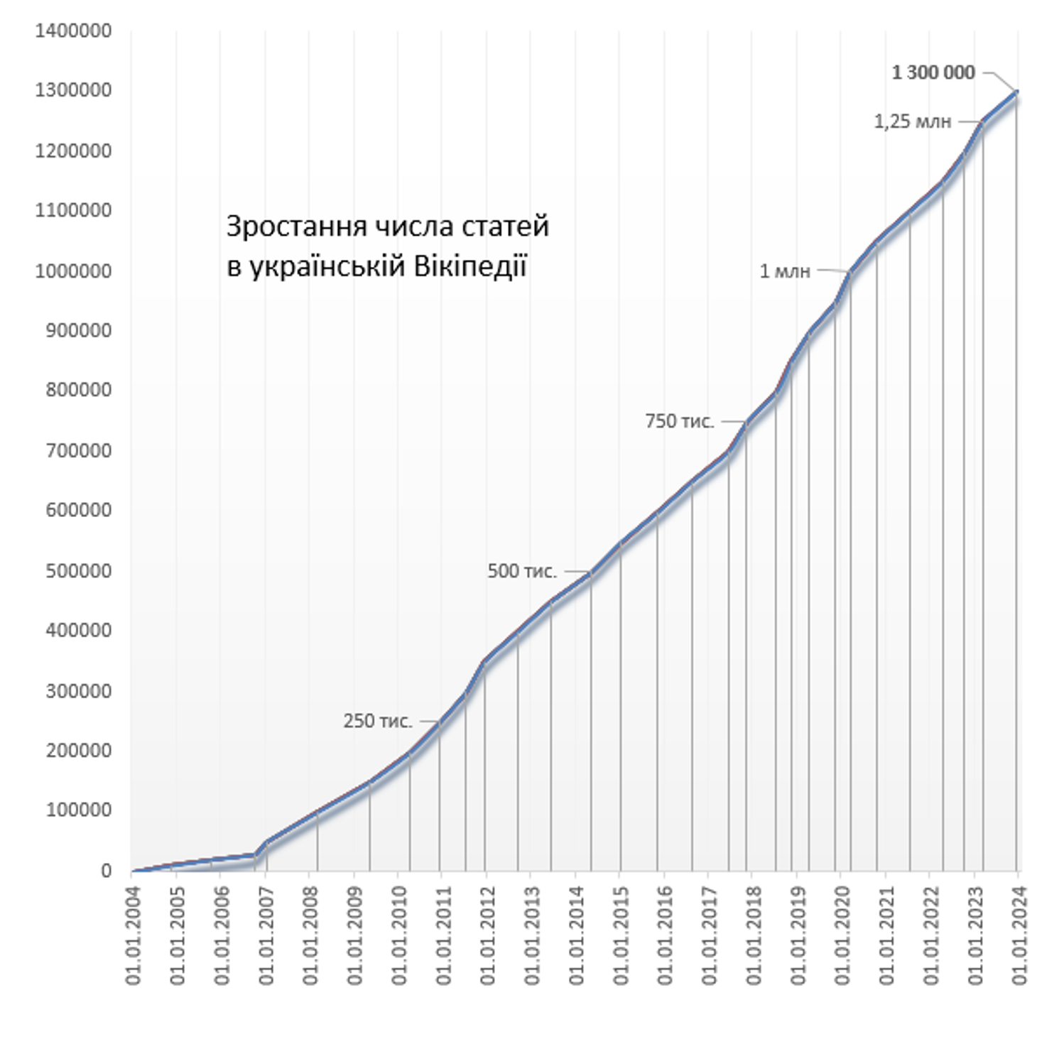 Загальне число статей в українській версії «Вікіпедії» на кінець 2023 року перевищило 1,3 млн, що є 14 показником у світі. Про це РеІнформ повідомляє з посиланням на сайт «Вікімедіа Україна».