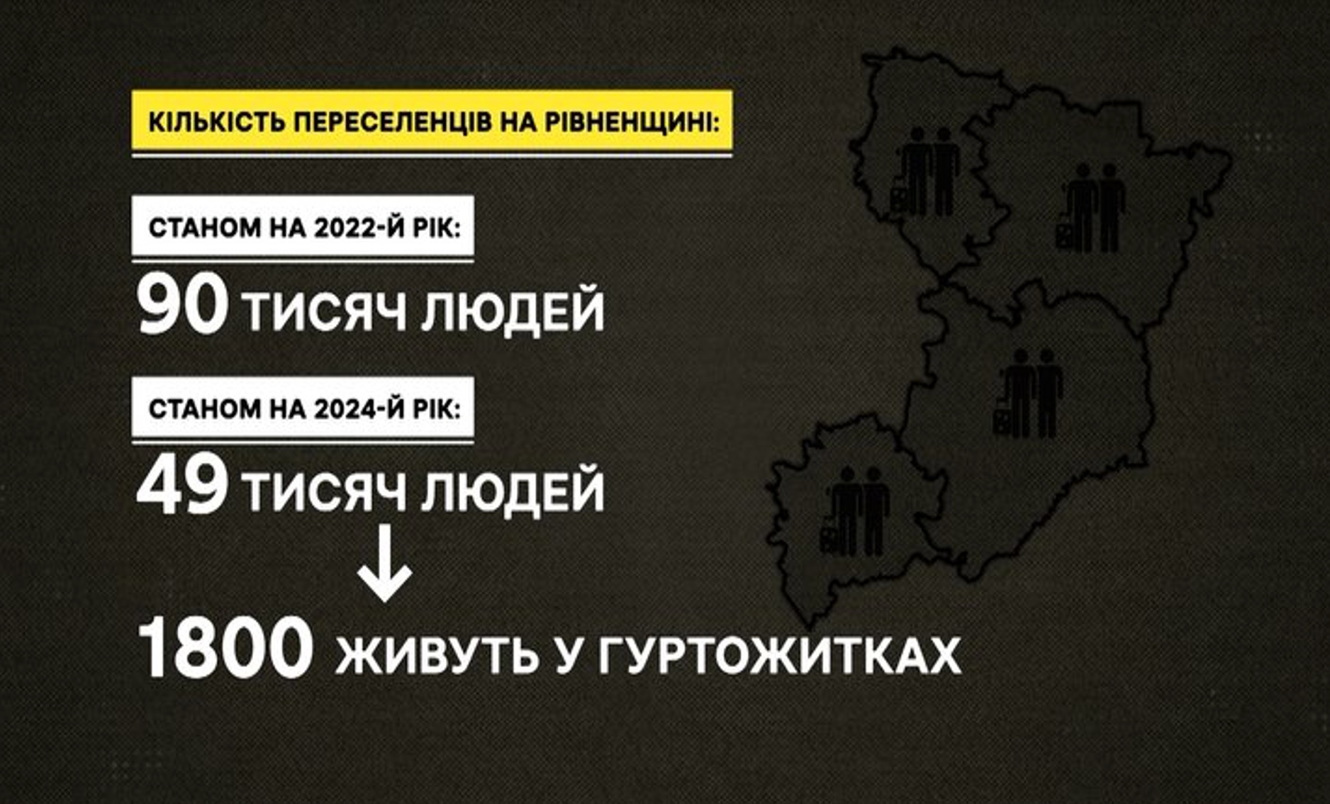 За даними начальниці Національної соціальної сервісної служби в області Юлії Шигоревої, наразі в області – 49 тисяч переселенців, 1 800 з яких проживають у гуртожитках та місцях компактного проживання. Залишила Рівненщину 41 тисяча ВПО.