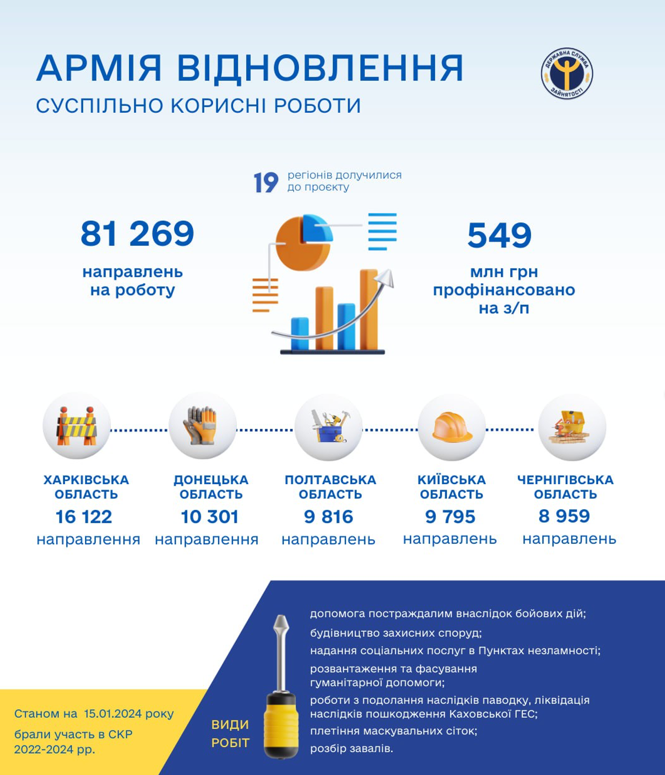 Зазначається, що станом на 15 січня цього року, починаючи з 1 жовтня 2022 року, Державна служба зайнятості видала 81 269 направлень на виконання суспільно-корисних робіт, найбільше — у Харківській області (16 122 направлення).