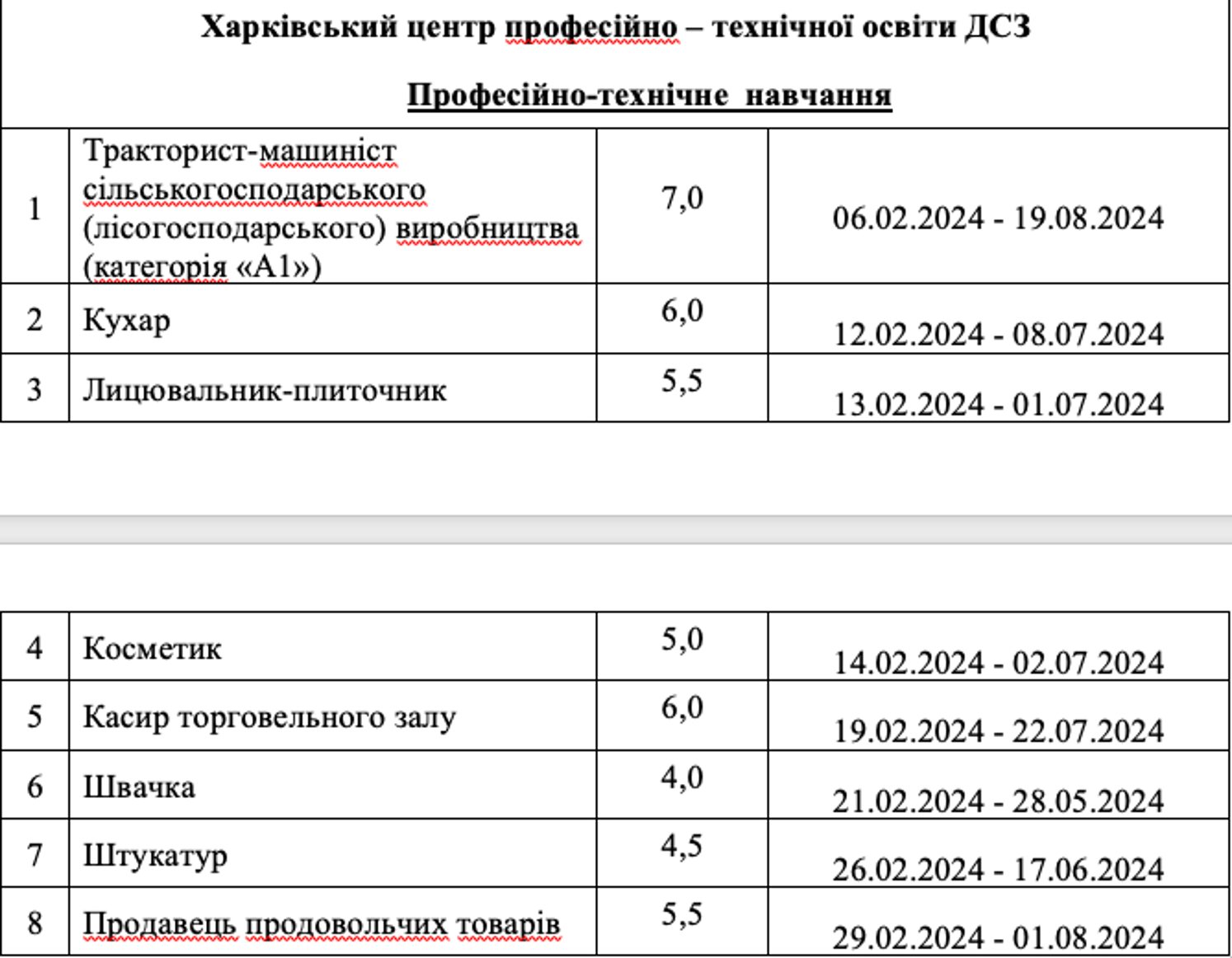 Тривалість навчання залежить від фаху: від 5 тижнів до 8 місяців. Перелік спеціальностей досить широкий: бухгалтер, перукар, продавець, зварювальник, тракторист, слюсар, бармен, візажист тощо.