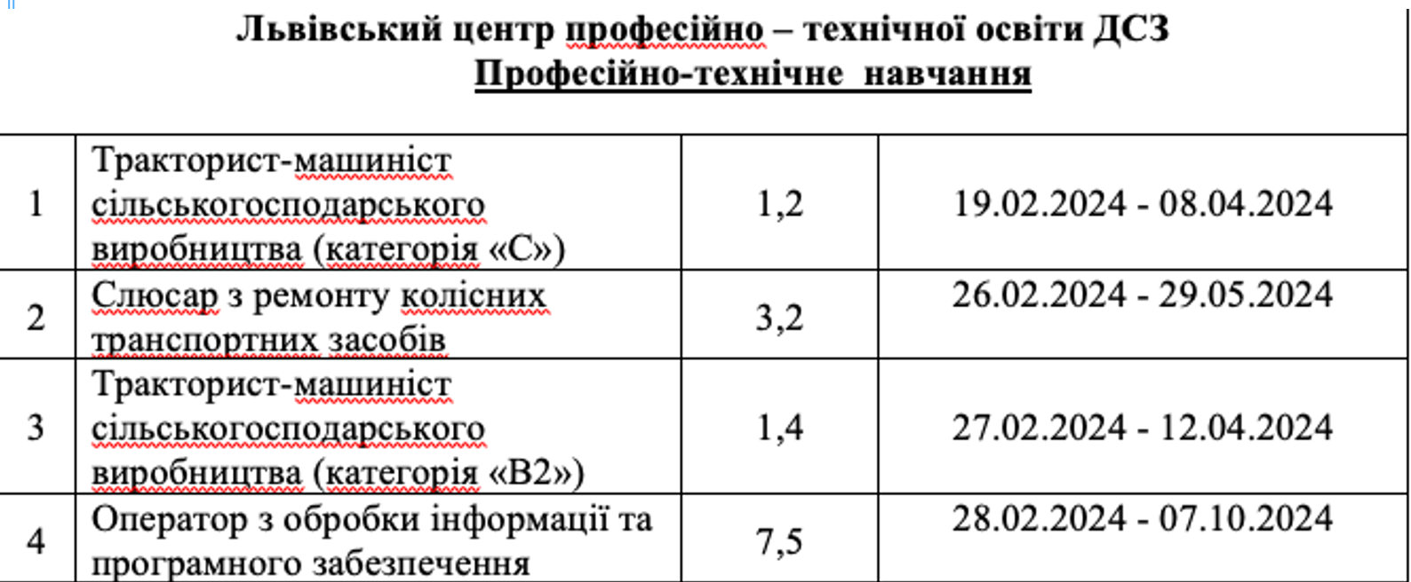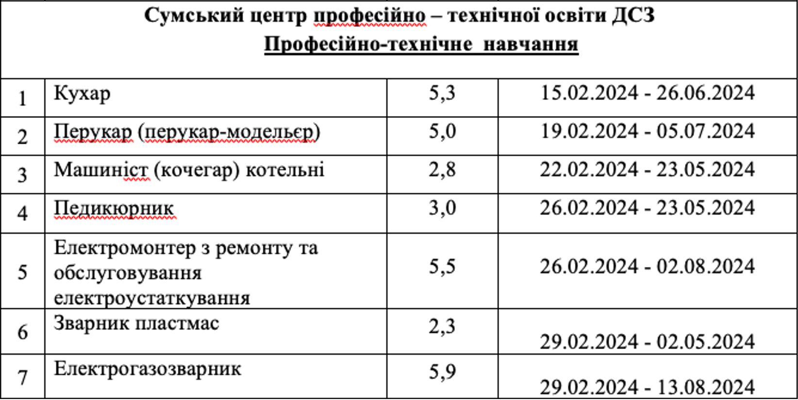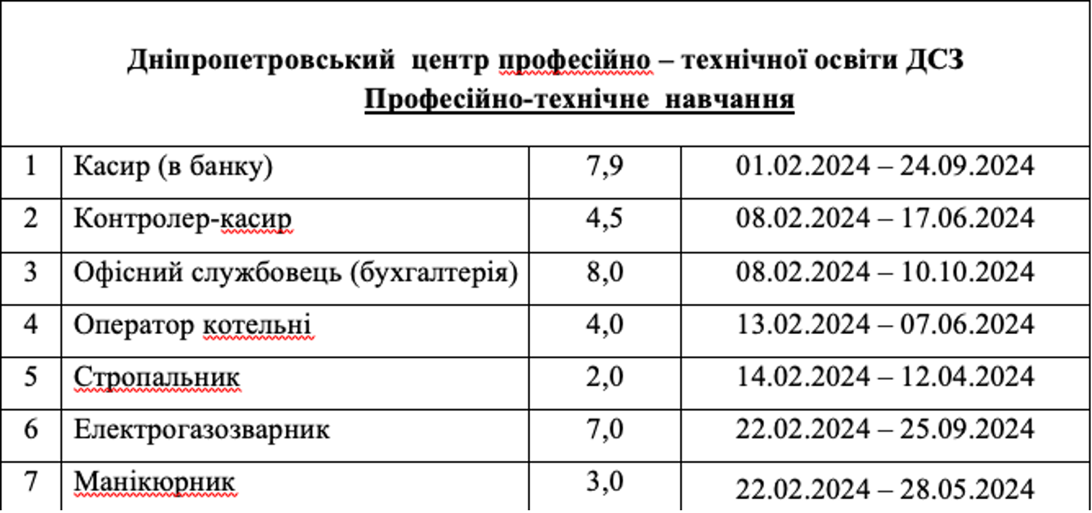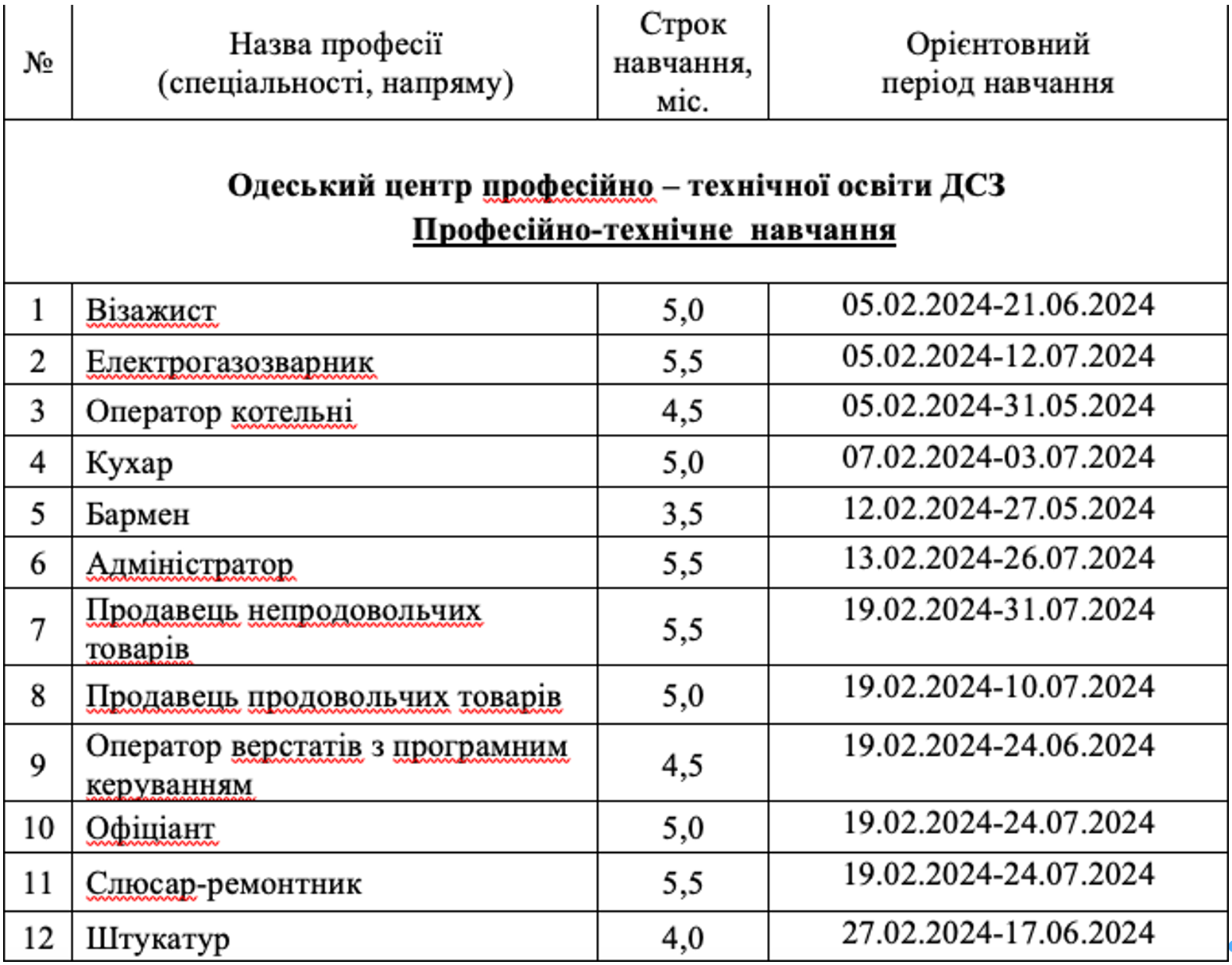 Зазначається, що курси проходитимуть в Одеському, Дніпропетровському, Рівненському, Львівському, Івано-Франківському, Сумському та Харківському центрах професійно-технічної освіти ДСЗ.