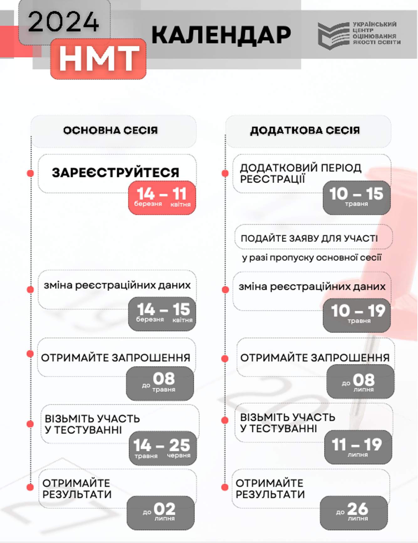 Основна реєстрація вступників розпочнеться 14 березня і триватиме до 11 квітня. До 15 квітня зареєстрований учасник матиме змогу в персональному кабінеті внести зміни (змінити предмет на вибір на інший чи змінити населений пункт в Україні / за кордоном, у якому він бажає пройти НМТ).