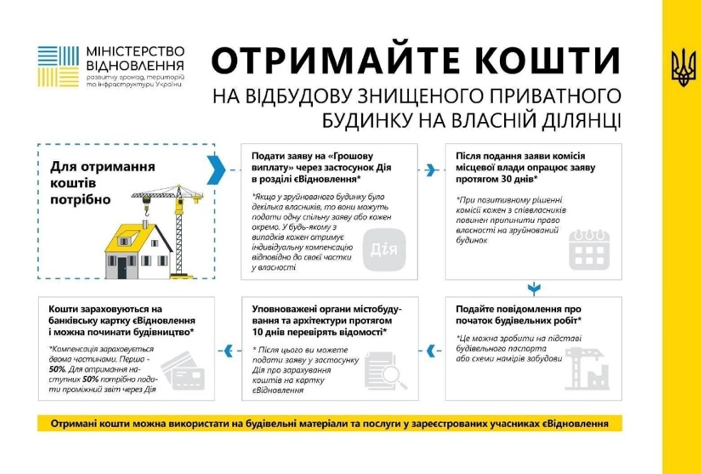 Зазначається, що у березні буде введено у дію процедуру надання послуги щодо відбудови приватних будинків на власних земельних ділянках –– з моменту отримання заявки до подання остаточної звітності про відновлення.