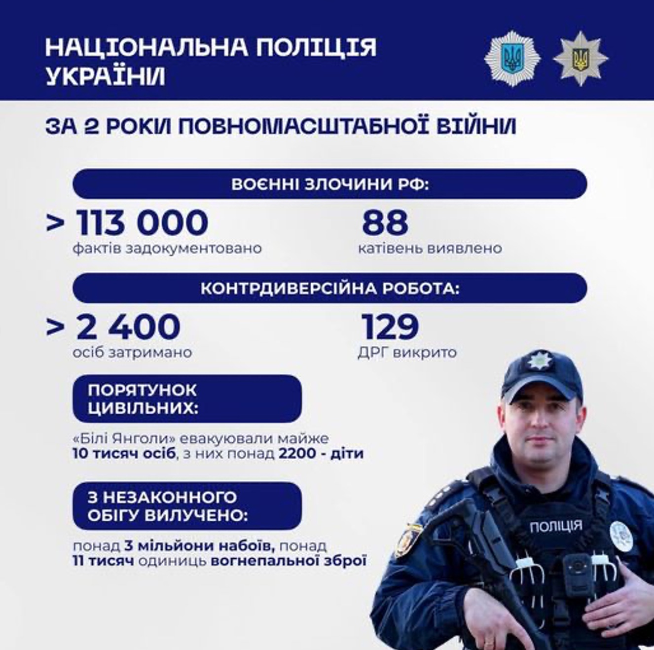 «За ці два роки слідчі поліції задокументували понад 113 тисяч воєнних злочинів армії рф. Також виявлено 88 катівень, де росіяни незаконно утримували сотні наших громадян та піддавали їх тортурам», – ідеться у повідомленні.