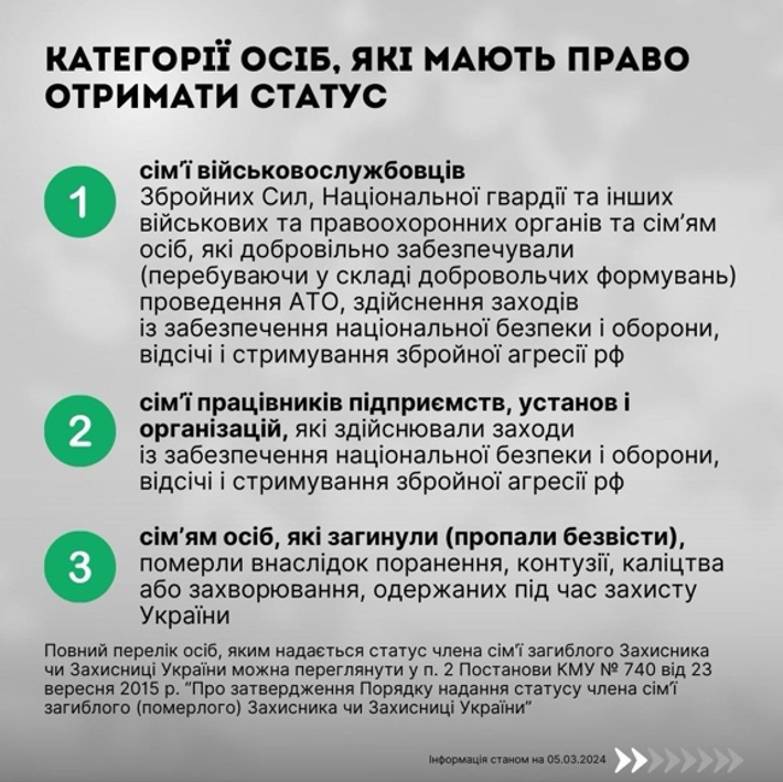 - сім’ї військовослужбовців (ЗСУ, Нацгвардії та осіб, які були у складі добровольчих формувань, забезпечуючи національну безпеку й оборону);